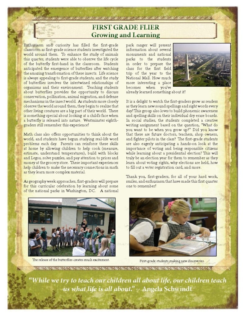 - Students in Westminster’s first grade program develop the ability to solve problems, make decisions, and take responsibility for themselves. The program builds on the integrated curriculum that begins in Kindergarten. The Westminster approach provides a comprehensive, integrated program in the areas of reading, writing, mathematics, science, social studies, French, art, music, and physical education.